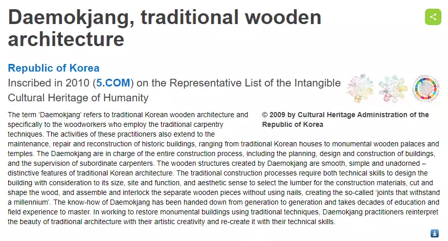 聯合國教科文組織網站對韓國「大木匠與傳統的木結構建築藝術」的介紹圖。圖片來源:聯合國教科文組織網站