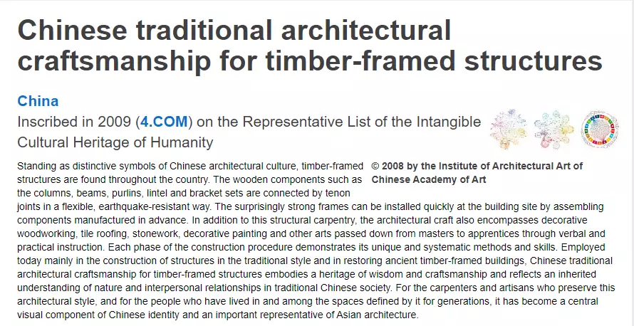 聯合國教科文組織網站對「大木匠與傳統的木結構建築藝術」的介紹。聯合國教科文組織網站截圖