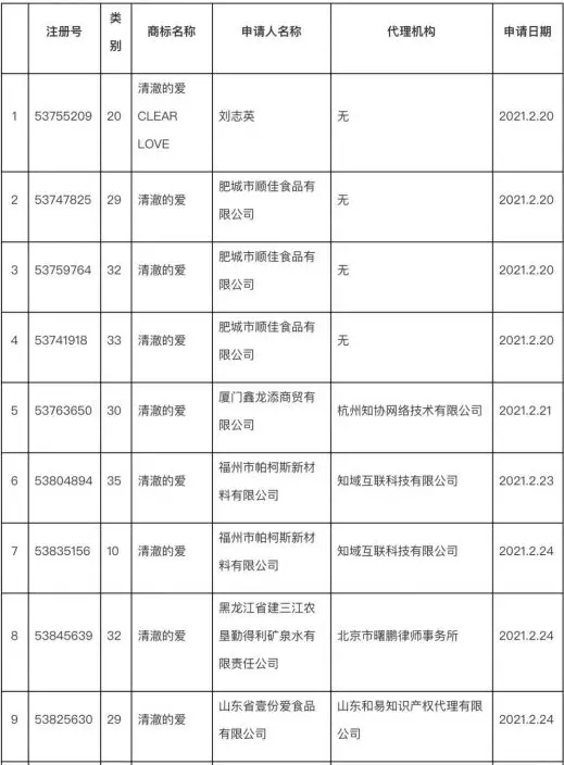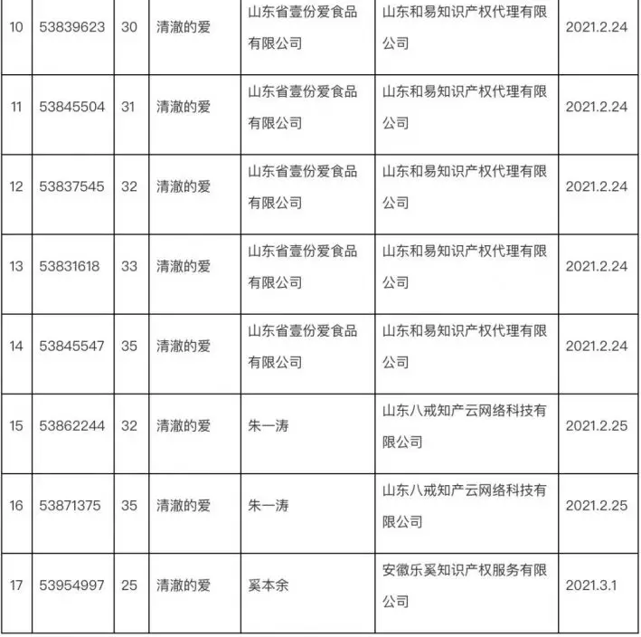 截至目前,共有5個商家,3個個人申請了共計17件「清澈的愛」相關商標,涉及食品、飲料、服裝等多個類別。其中山東省壹份愛食品有限公司共申請6件「清澈的愛」商標,涉及食品、啤酒飲料、廣告銷售、飼料種籽等類別。