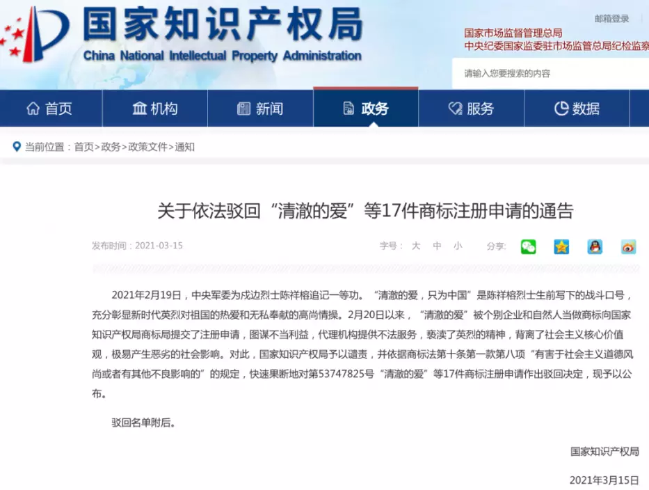 3月15日,國家知識產權局網站公佈了《關於依法駁回「清澈的愛」等17件商標註冊申請的通告》。