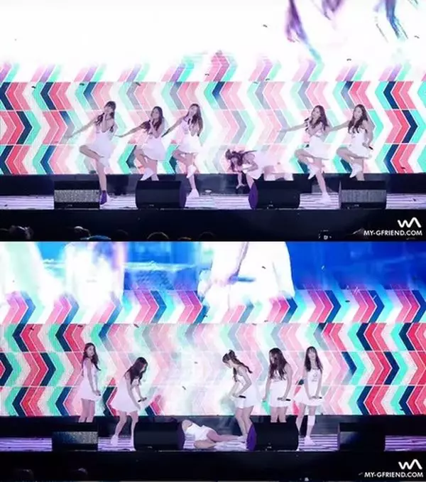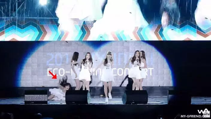 G-FRIEND六位成員日前在現場演唱主打歌《Me gustas tu》時,舞台因為下雨關係而相當濕滑,令她們即使穿着波鞋也跣腳,表演時狂跌八次,光是成員Yuju一人在慘跌五次;Yuju事後亦在官方網站上報平安。