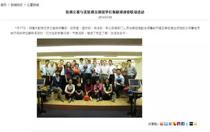 事緣外交部駐香港特別行政區特派員公署網站最近公開一則新聞:月中公署人員在副特派員胡建中率領下,與美駐港副總領事俞天睦及美駐港總領館部分領事官員舉行保齡球迎春聯誼活動。