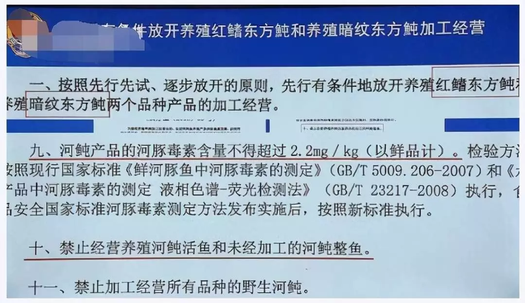 多年來,我國政府一直是嚴禁食用河豚的。2016 年,國家農業部和食葯監總局聯合發佈了《關於有條件放開養殖紅鰭東方魨和養殖暗紋東方魨加工經營的通知》,給人工養殖的「紅鰭東方魨」和“暗紋東方魨”這兩個品種解了禁。
