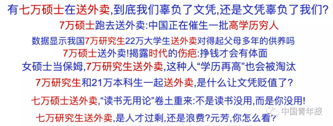 但另有網傳統計稱「全國共有700萬外賣小哥」。就這樣,兩個並不具有代表性的“1%”,被自媒體簡單渲染成「全國七萬碩士在送外賣」。