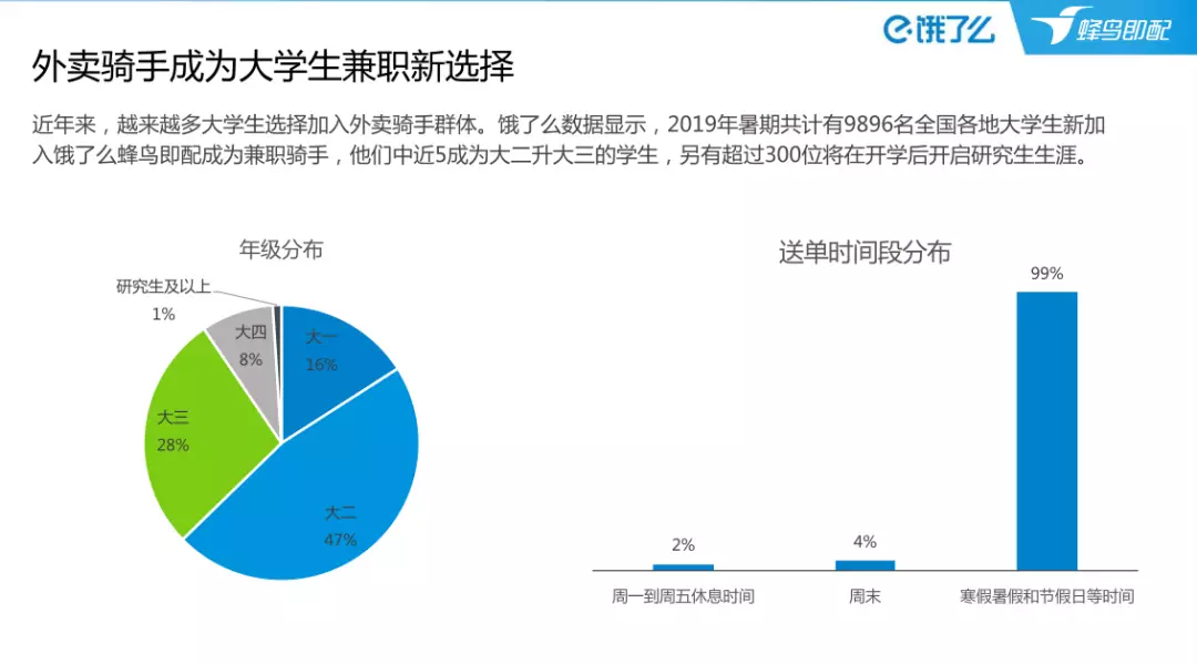 餓了么的報告指出,2019年暑期共計有9896名全國各地大學生新加入餓了么蜂鳥即配成為兼職騎手。在年級分佈上,有1%是研究生及以上:
