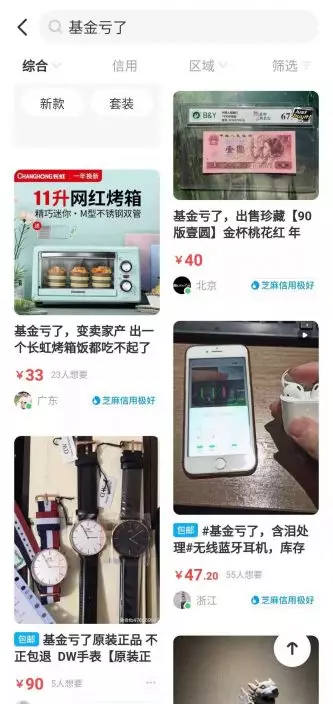 在閑魚搜索「基金虧了」,會出現很多轉賣信息,包含首飾、包包、數碼產品、收藏品等。