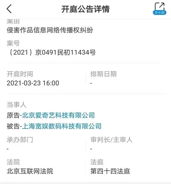 北京法院審判信息網顯示,北京愛奇藝科技有限公司公開與上海寬娛數碼科技有限公司(B站)相關侵害作品信息網路傳播權糾紛案件的開庭公告,案號為(2021)京0491民初11434號等,由北京互聯網法院經辦。開庭日期為2021年3月23日。
