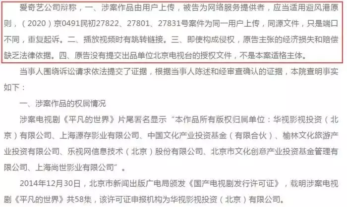 另,裁判日期為2020年12月2日的西藏樂視網信息技術有限公司與北京愛奇藝科技有限公司侵害作品信息網路傳播權糾紛一審民事判決書顯示,愛奇藝公司辯稱,涉案作品由用戶上傳,被告為網路服務提供者,應當適用避風港原則,多個案件為同一用戶上傳,同源文件,只是埠不同,重複起訴。