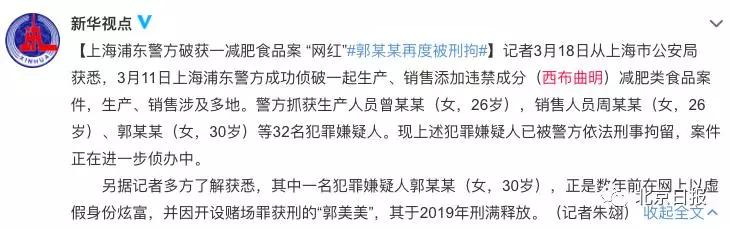 這一次,上海警方刑拘郭美美的理由是生產、銷售添加違禁成分(西布曲明)減肥類食品,這可能已經涉嫌生產銷售有毒有害食品罪。在國家歷來嚴厲打擊涉食品犯罪的語境下,郭美美可能又要遇到「大麻煩」了。