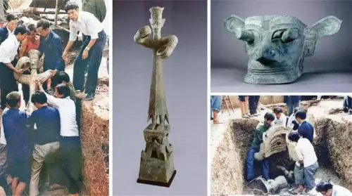 圖為1986年三星堆遺址一、二號祭祀坑發掘現場,以及出土的銅大立人像和銅縱目面具。(來源:求是網)