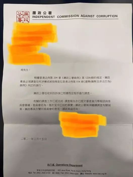 他又上傳廉政公署日前所寄出的信件。署方在信中表示,根據《廉政公署條例》,廉政專員需調查任何涉嫌或被指稱觸犯《選舉(舞弊及非法行為)條例》所訂的罪行。署方在收到投訴後,已根據既定程序展開調查,並已完成調查工作,調查報告亦已提交審查貪污舉報諮詢委員會審議。委員會認為,基於至今已知的事實,署方毋須繼續調查有關個案。