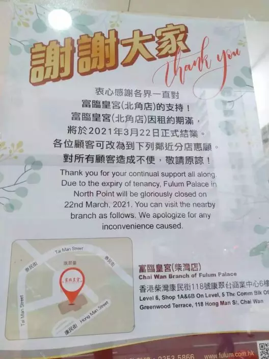 隨著社交距離措施收緊及防疫規例增加,食肆生意大受打擊,一年來不少有餐廳抵不住疫情打擊而選擇結業。富臨集團旗下的富臨酒家上水分店於上年2月宣布結業後,位於北角的富臨皇宮今日亦貼出告示,宣布由於租約期滿,將於明日(22日)起正式結業。
