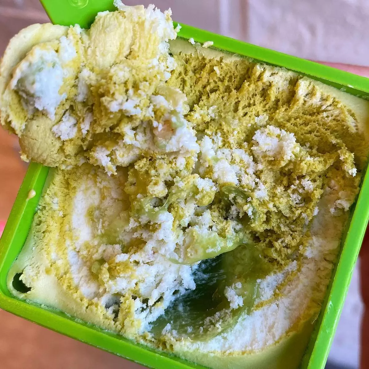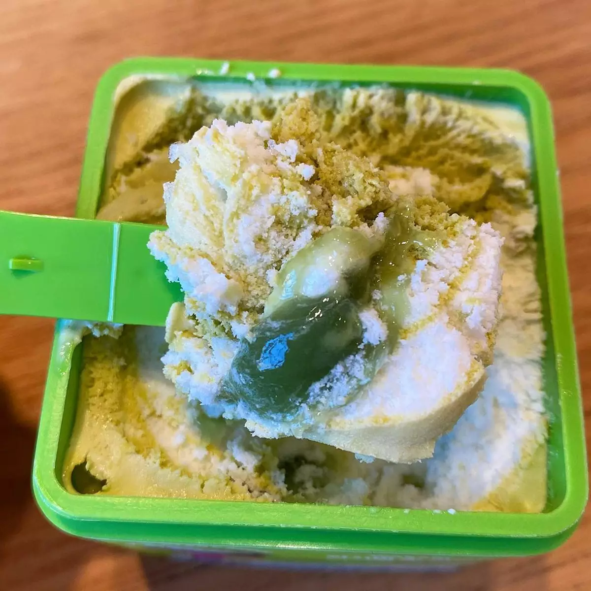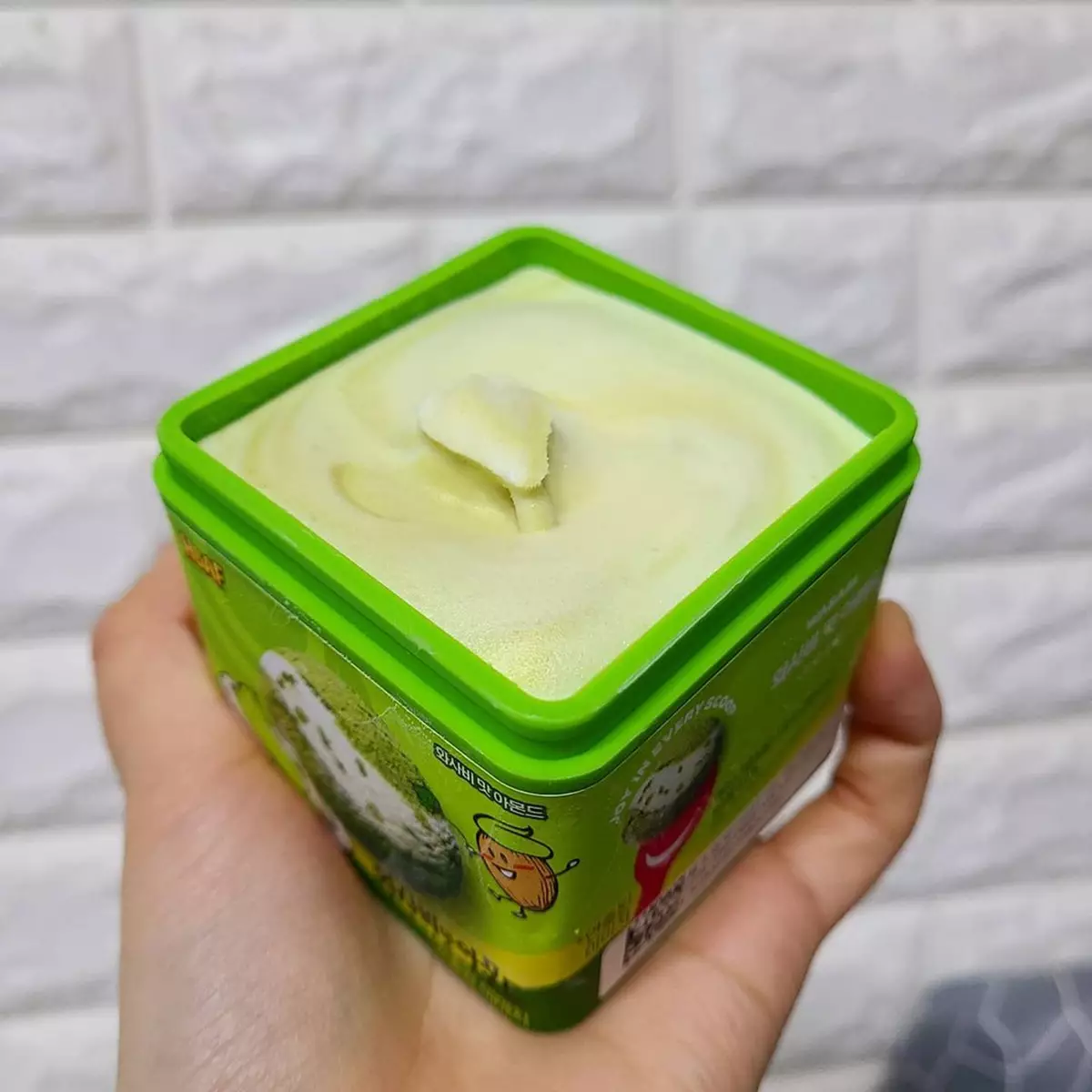 全新芥末杏仁口味以雪糕Lego盒子的形式發售,一打開就能夠看到淺綠色和米黃色混合的雪糕,主要以雲尼拿雪糕作基底,所以剛開始時口味依然是偏甜。不過吃到中間就可以見到綠色的醬料,而這些正正就是芥末味的糖漿,讓辣度一下子提升不少。再加上混合在雪糕内的芥末杏仁碎,辣上加辣至於整體口感也非常豐富。