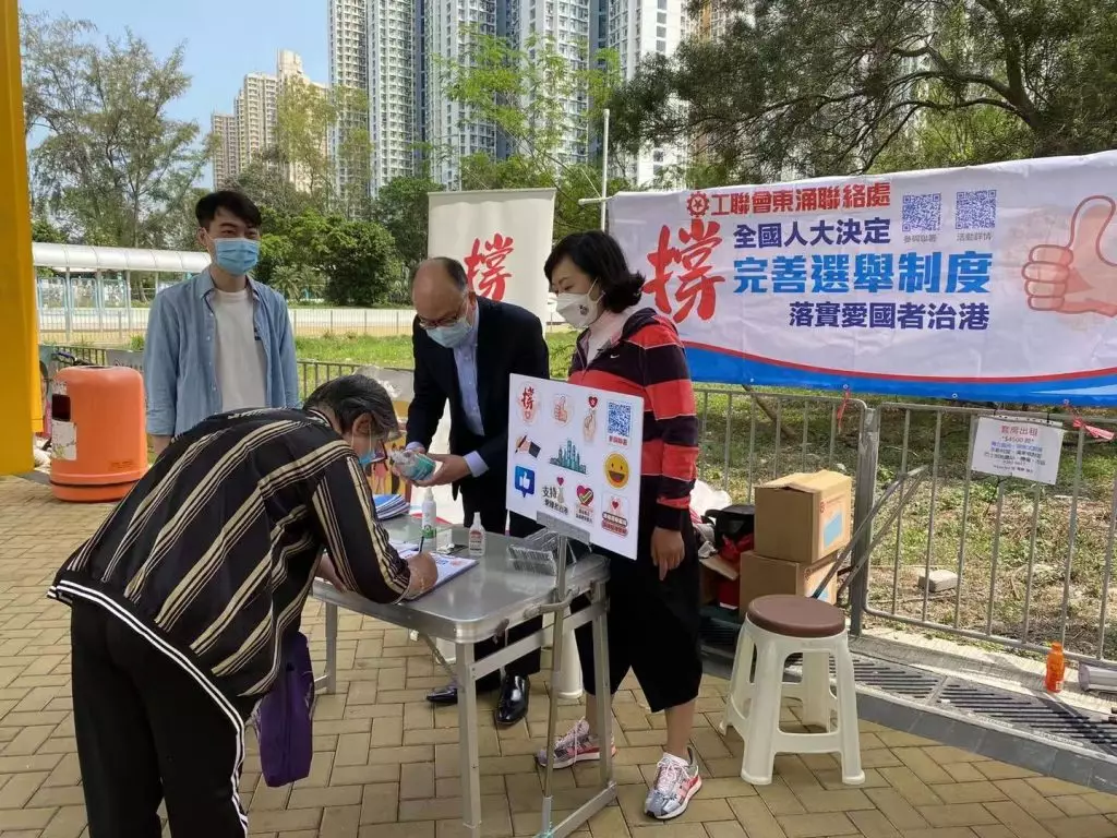 原來這名年輕男子是工聯會社區幹事何偉俊,3月13號當日,他在沙田大圍愉景花園擺設街站,邀請市民簽名支持完善香港選舉制度,解釋愛國者治港的準則。