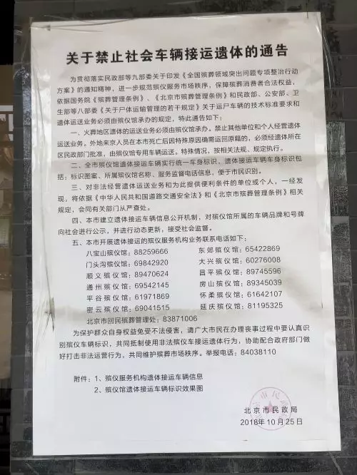 在某殯儀館,記者也在牆上看到北京市民政局在2018年10月25日印發的《關於禁止社會車輛接運遺體的通告》。其中第三條規定,對非法經營遺體運送業務和為此提供便利條件的單位或個人,一經發現,將依據《中華人民共和國道路交通安全法》和《北京市殯葬管理條例》相關規定,會同有關部門從嚴查處。在通告旁,還張貼有殯儀服務機構遺體接運車輛信息和殯儀館遺體接運車輛標識效果圖。