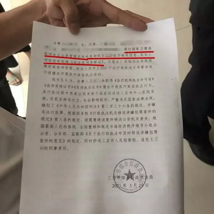 今天上午,記者聯繫到了三亞市綜合行政執法局,了解到執刀醫美手術「醫生」王某華並不具備行醫資格,她所謂的工作室也沒有相關營業執照。她只是在廣州培訓過並取得高級美容師資格。29日,執法人員對王某華下達文書,要求其不得擅自開展醫療美容執業活動。同時,王某華涉嫌非法行醫罪,案件已經已送公安機關查處。