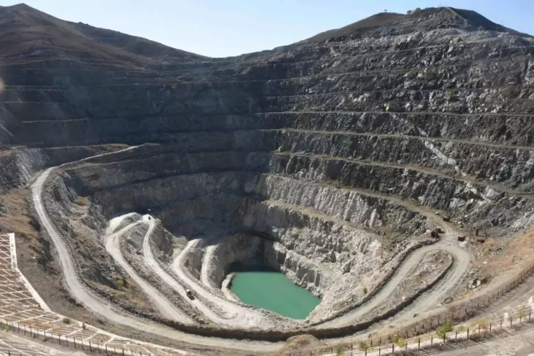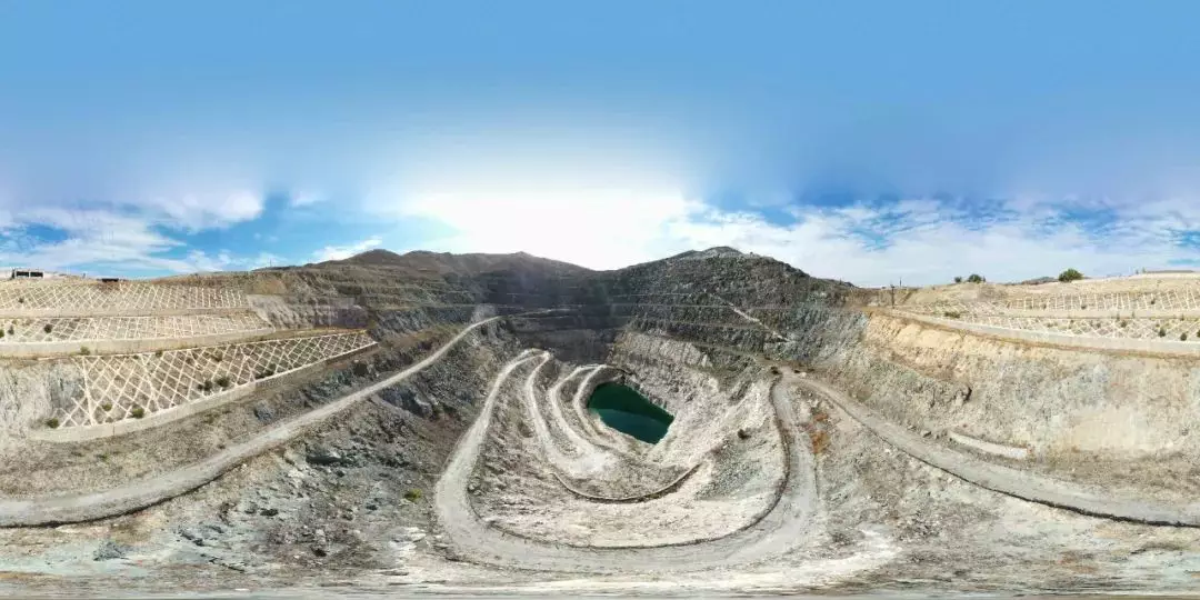 下方是一座縱深數百米的巨型礦坑,沿著坑體邊緣環繞著一圈又一圈石子路,沿路又零星分佈著一眼眼礦洞,在其中幾個礦洞洞口,還有工人施工留下的工具和器械。或許是礦坑已深及儲水層,坑底淤積著一汪幽藍的水,像只明亮的眸子。