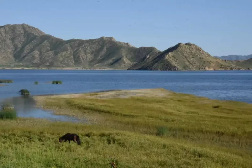 當一汪澄澈的湖水霍然出現時,我們已從石頭山的山南翻至山北。湖水鑲嵌在大山間一片低洼處,湖畔搖曳著發黃的蘆葦稈。車輛下山的用時只有上山時的四分之一,似乎前一秒還在車廂內極目遠望,下一秒就在湖岸邊沐風而立。湖的名字叫可可蘇里,是一處天然沼澤濕地。距可可蘇里湖不遠,還有一汪名為伊雷木的湖泊。地質工作者介紹,兩個湖都是由多期構造作用下的湖盆積水而成。