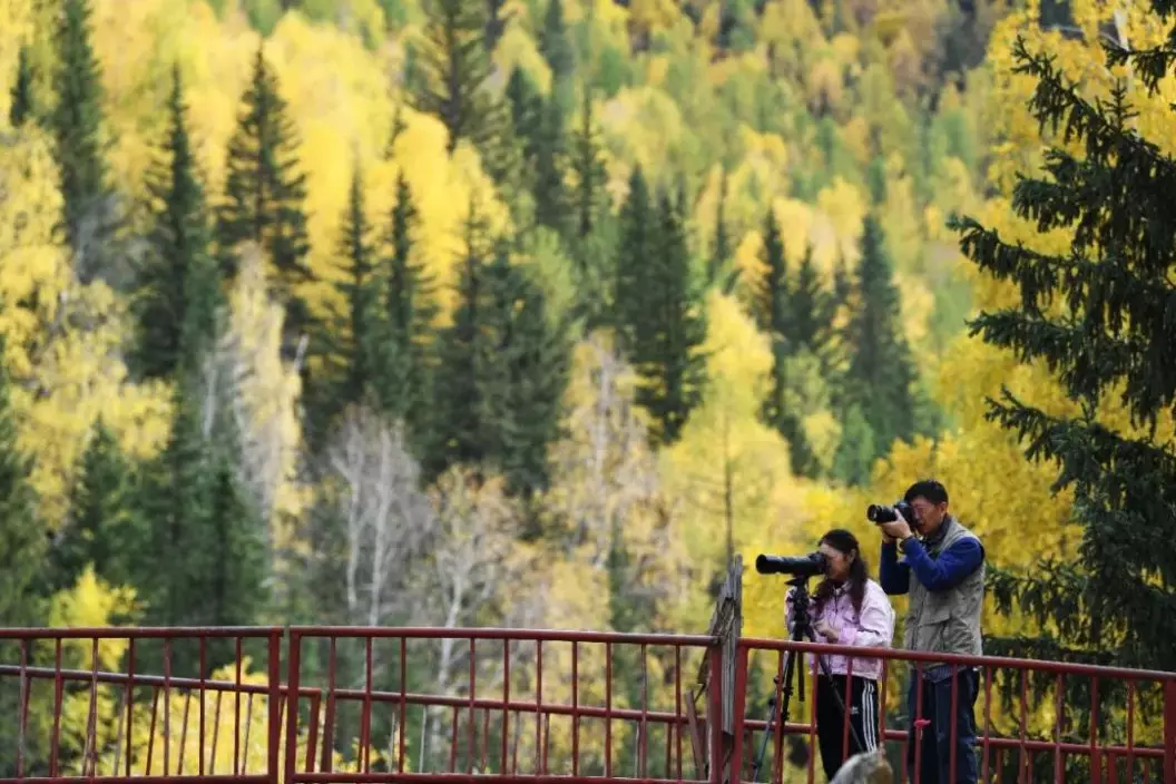 兩名遊客在新疆富蘊縣國家5A級景區可可托海景區拍照。新華社記者沙達提攝