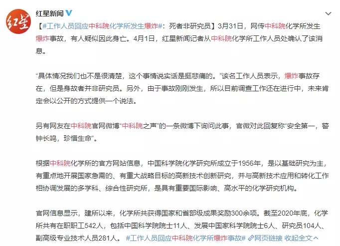此後,「紅星新聞」也從中科院化學所工作人員處確認了該消息:“具體情況我們也不是很清楚,這個事情說實話是挺悲痛的”,該名工作人員表示,爆炸事故存在,但是身故者並非研究員。另外,由於事故剛剛發生,所以目前調查工作還在進行中,未來肯定會以公開的方式提供一個說法。