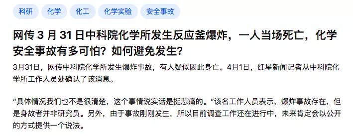 據知乎上一則話題,2021年3月31日,中國科學院化學研究所發生實驗室安全事故,一人死亡,事故的具體原因仍在調查中。