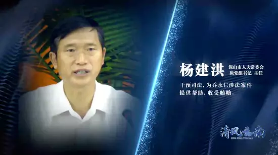 保山市人大常委會原黨組書記、主任楊建洪干預司法,為喬永仁涉法案件提供幫助,撐腰站台,收受賄賂。