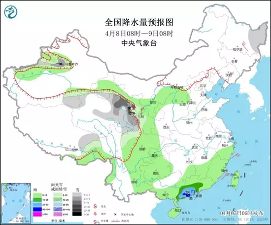 明天,南方的降雨有所收斂,但華南局地仍強降雨現身,華南南部等地部分地區有中到大雨,局地暴雨。此外,新疆沿天山地區、黑龍江東部、西藏東部、青海北部和東部、甘肅中南部、川西高原北部等地部分地區有小到中雪或雨夾雪,局地有大到暴雪。