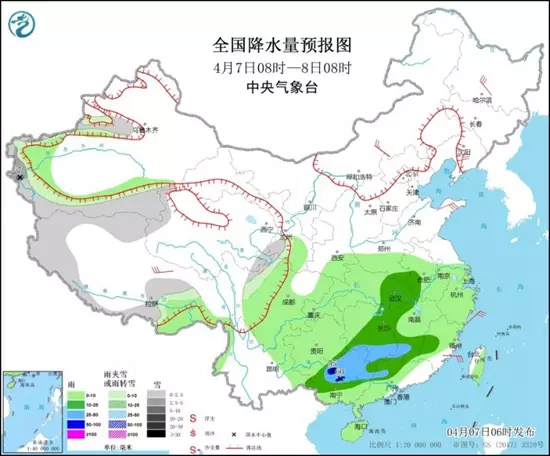 中央氣象台預計, 今天江南、華南地區仍將有大範圍降雨,其中,新疆南疆盆地和南疆西部山區、西藏西北部和南部、青海西部、甘肅南部、川西高原北部等地部分地區有小雪或雨夾雪,局地中到大雪。江淮西部、江漢東部、江南西部和南部、華南大部等地部分地區有中到大雨,局地暴雨。