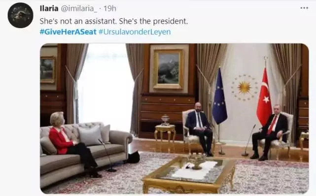 此事一出,多家外媒都認為這再次體現出土耳其忽視女性權益的現狀。有網友發佈現場圖片,寫道「她是主席,不是秘書。」一時間,「給她一把椅子」(GiveHerASeat)「沙發門」(Sofagate)「女性權益」等詞條衝上熱搜。