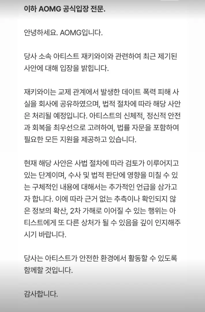 目前,Jvcki Wai的所有爆料內容均已刪除或設為非公開,她的經理人公司AOMG於12月15日發表官方聲明,表示Jvcki Wai已向公司報告暴力事件:「該事件將按照法律程序處理。」AOMG強調,將藝術家的身心安全與恢復置於首位,包括提供法律諮詢在內的一切必要支持。由於事件正處於司法審查階段,公司表示「關於可能影響調查及法律判斷的具體內容,我們將不再作進一步說明。」同時呼籲外界避免無根據的揣測或未經證實資訊的傳播,以防造成二次傷害。