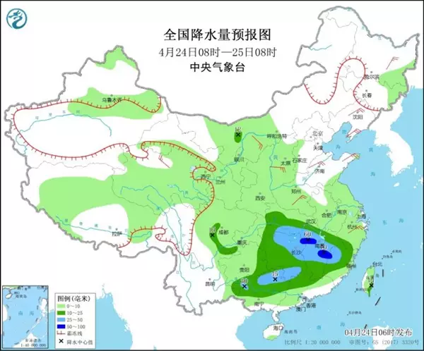 預計,今明天(4月24日至25日),我國中東部降水範圍較廣。其中,今天江漢南部、江南大部雨勢較強,局地有暴雨;明天降雨強度逐漸減弱。氣溫方面,周末南方將現降溫,北方的西北地區、黃淮等地氣溫持續低迷。