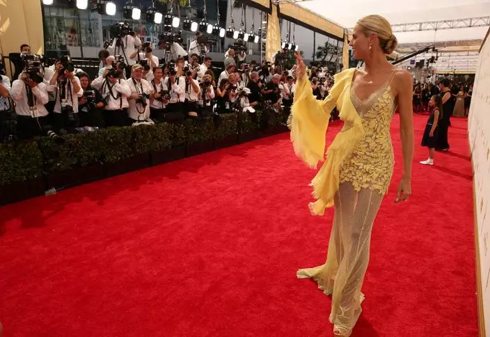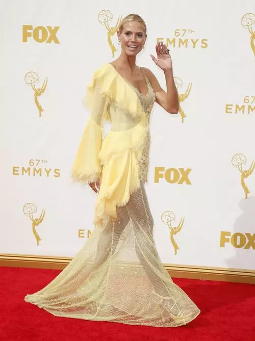 憑《Project Runway》獲提名的Heidi身穿Versace高級訂製禮服現身紅地壇大露美背,黃色雪紡禮服以不對稱剪裁搭配手工刺繡珠飾,高雅得來亦盡顯女人味,而側身透視設計亦盡顯她長長美腿,非常性感。