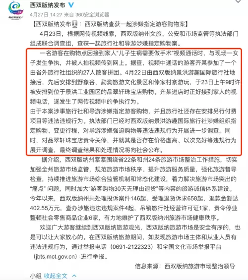 官方通報:關停涉事店鋪對旅行社和導遊展開調查4月27日,雲南省西雙版納州政府新聞辦官方微博@西雙版納發佈 就此發佈通報。