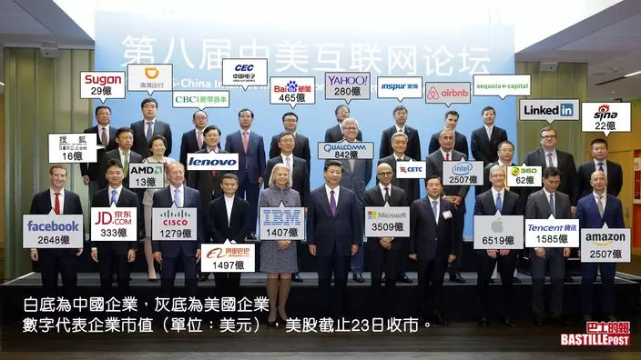 相中所有人都是中國和美國科技企業巨頭的領導層,每人下個決定都足以撼動全球股市。粗略估算一下,這裏各人代表的公司市值合共三萬億美元。