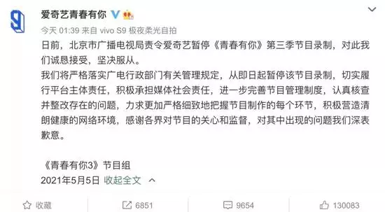 視局責令愛奇藝暫停《青春有你》第三季節目錄製,對此節目組誠懇接受,堅決服從。