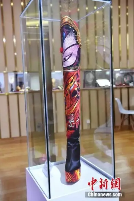 圖為四川館展示的川劇臉譜主題長靴。中新社記者 崔楠 攝