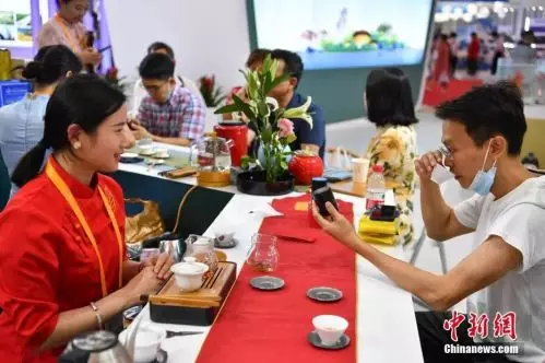 圖為參觀者在福建館品嘗武夷岩茶。中新社記者 崔楠 攝