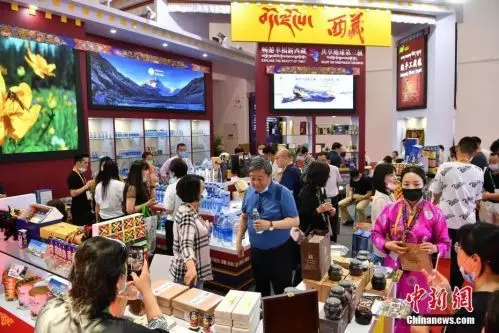 圖為眾多參觀者在西藏館參觀購物。中新社記者 崔楠 攝