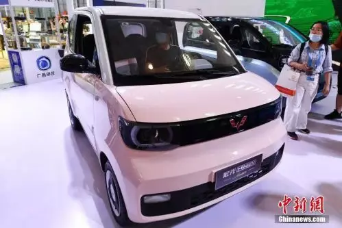 圖為廣西館展出的五菱MINI EV電動車受到參觀者關注。中新社記者 崔楠 攝