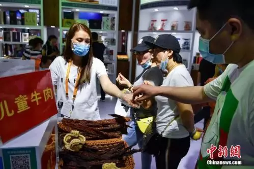 圖為參觀者在甘肅館品嘗牛肉乾。中新社記者 崔楠 攝