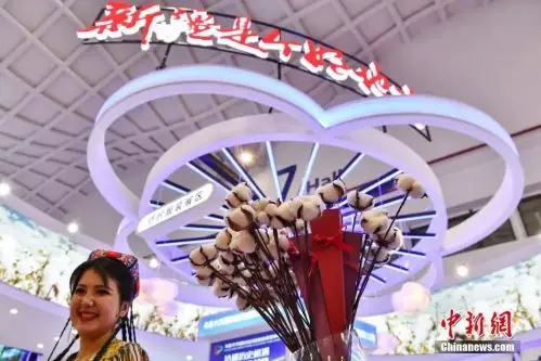 新疆展區以享譽世界的新疆棉花作為主要設計素材,在展示新疆紡織服裝、農產品、食品、紅酒、珠寶玉器、文化創意、醫療醫藥等特色優勢產業的同時,通過聲、光、電等方式,呈現繁榮美麗的新疆形象。