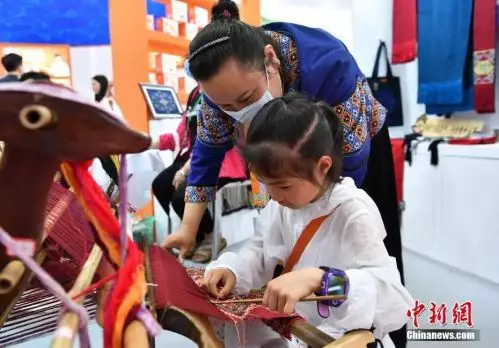 圖為小朋友在湖南館體驗土家族傳統織布技藝。中新社記者 崔楠 攝
