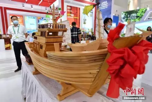 圖為遼寧館中展出的盤錦遠航船廠製作的木製船模。中新社記者 崔楠 攝