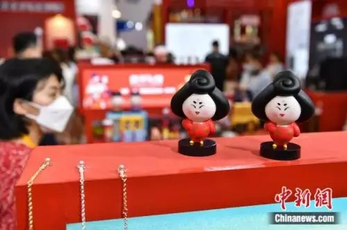 在陝西館,憨態可掬的「唐妞」在顯著位置奪人眼球。這是陝西歷史博物館基於館藏唐代仕女俑設計的形象,還衍生出「唐妞」系列文創產品,深受公眾喜愛。消博會上,「唐妞」系列公仔、鑲金獸首瑪瑙杯(復刻品)等眾多展品讓參觀者產生濃厚興趣。