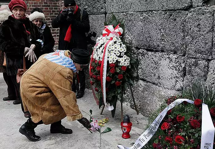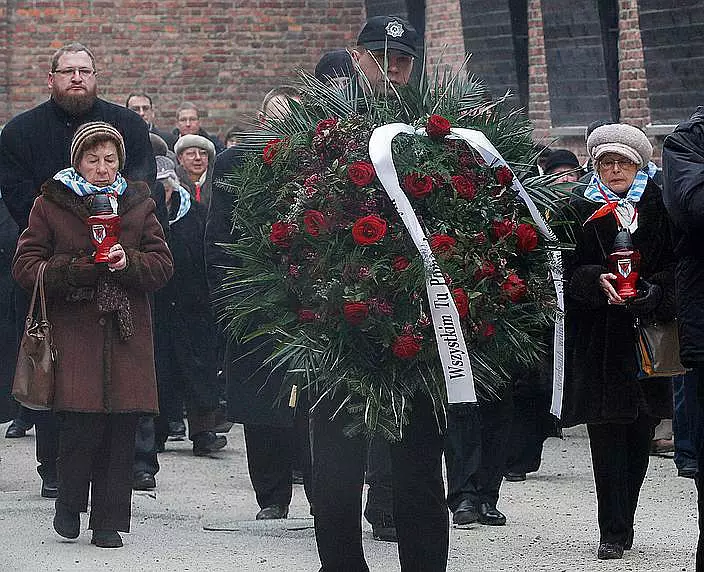 倖存者在死亡牆、焚屍爐、毒氣室、吉普賽人紀念碑,和前蘇聯紅軍戰俘墓碑前獻花、點燃蠟燭,並默默祈禱,緬懷大屠殺遇難者。