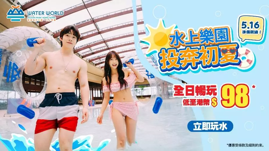 2026年4月16日至6月30日,水上樂園推出「投奔初夏」門票優惠,只需低至港幣98元,即可購買適用於2026年5月16日至7月3日入場的門票,盡享所有水上設施的樂趣。詳細票價如下: