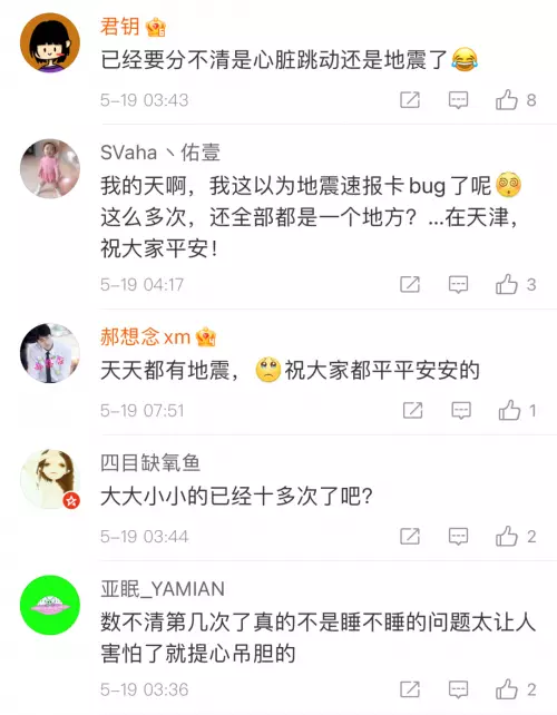 面對三小時內連續發生的多次有感地震,一些網友表達了自己的擔憂。有網友猜測:「這幾次地震之後,會不會意味著更大的地震要來了?」