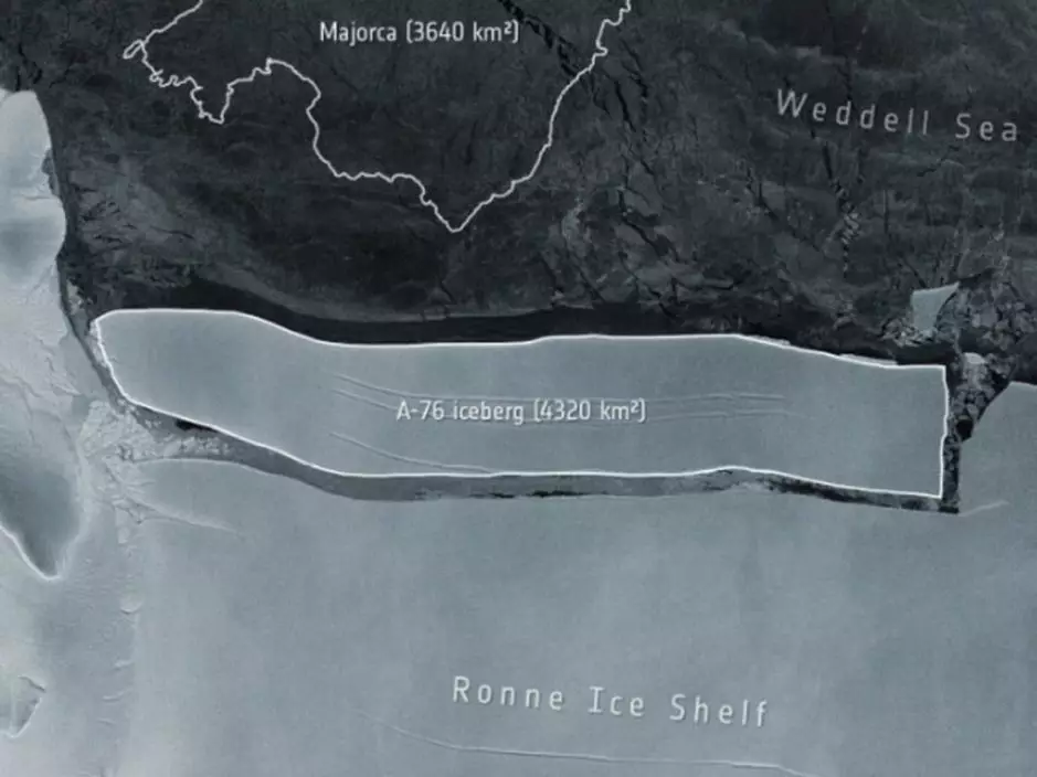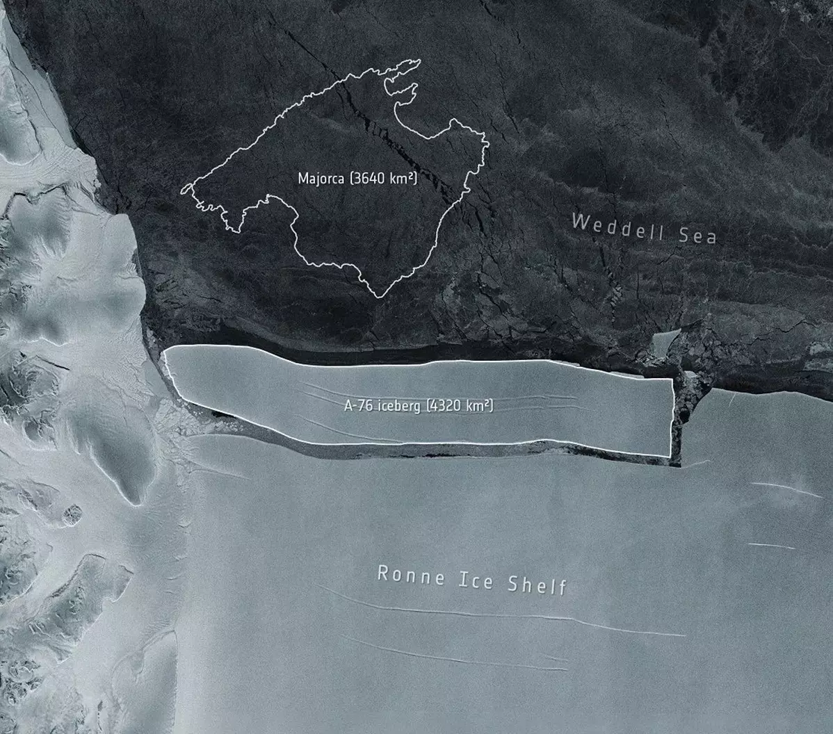 歐洲太空總署表示,全球最大冰山近日從南極洲的邊緣脫離「龍尼冰架」,形狀酷似一塊巨大的熨衫板。該冰山長約170公里,寬約25公里,面積約為4320平方公里,大小接近紐約曼哈頓面積的80倍。該冰山於上周被首次發現,被命名為冰山「A-76」。冰山脫離屬於自然現象,巨大的冰塊每隔一段時間就會從冰架上脫落。科學家們沒有將此次發生的冰山脫離現象歸因於氣候變化,而是認為這是該地區冰山自然周期的一部分。