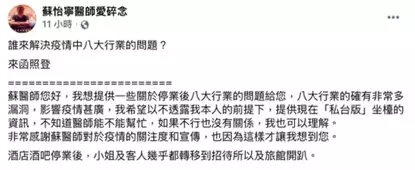 根據蘇怡寧該則臉書貼文,有網友傳遞透露,稱許多八大行業的業者,17日酒店、酒吧依規定停業後私下動作不斷,頻頻發出徵召信息,地點遍佈板橋、台中、桃園中壢、基隆、高雄等,其中不乏疫情熱區,信息中還提醒小姐記得戴口罩防疫。