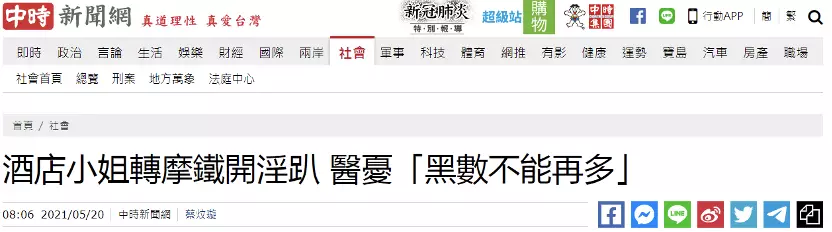 台灣疫情嚴峻,本土確診案例連日暴增,台灣婦產科醫生蘇怡寧昨(19)日在臉書轉貼網友私信,對方在內容提到,八大行業受疫情影響嚴重地下化,酒店、酒吧停業後,小姐和客人全轉移到招待所、旅館、摩鐵(汽車旅館)開房,所以希望通過醫師公開發聲,讓各界正視疫情破口。